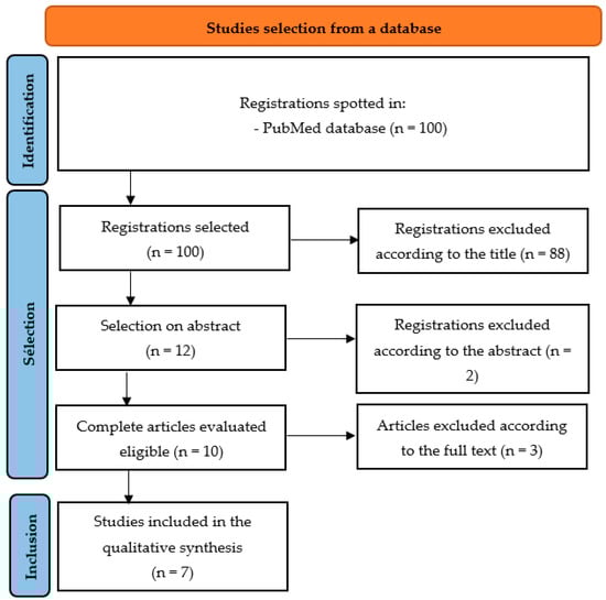 The search strategy detailed above yielded 100 results. Of the remaining 100, 88 articles were not selected based on their title. Of the remaining 12 articles, a new selection was made based on the abstract, and 2 articles were excluded. Ten articles were retained for a full reading of the article, and seven were included in the systematic review. The excluded articles did not meet the inclusion criteria. The details of the study selection process are shown in Figure 1 (PRISMA flow chart). None of the references cited in the articles selected according to title and abstract were retained.