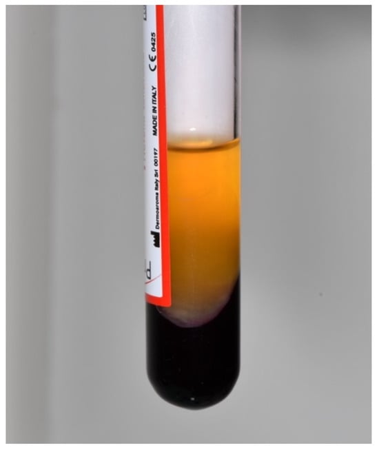 Systemically, healthy patients with Stage III grade A periodontitis, with a total of 26 periodontal pocket sites, were selected, having a 5 to 6 mm probing depth and two quadrants with contralateral sides, and randomly assigned to a test and control group using the coin toss method. After completing clinical and radiographic evaluations, patients were treated for their periodontal disease. The periodontal charting was performed using the North Carolina Probe (Hu-Friedy, LLC, Chicago, IL, USA). The periodontal treatment was performed by the same operator for all the patients. Both the test and control group underwent the SRP with a Full-Mouth Disinfection Protocol. Gracey curette and After five Gracey curette (Hu-Friedy, LLC, Chicago, IL) and ultrasonic debridement (Piezo Master 400, EMS®, Nyon, Switzerland) were used to perform the SRP. The experimental group involved pockets treated with SRP with the concomitant insertion of PRF membrane. Blood (40 mL) was collected from each patient in four dry glass tubes of 10 mL each. The blood collection was performed swiftly, and the tubes were promptly centrifuged at 4000 rpm for 8 min using a dedicated centrifuge (PC-02, Process for PRF, Nice, France) at room temperature. After the centrifugation, the tube exhibited three distinct parts: the upper one containing Platelet-Pure Plasma (PPP), the middle one composed of a PRF fibrin clot, and the lower containing red blood cells (RBCs) (Figure 1).
