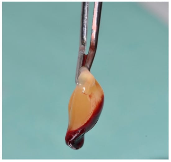 The PRF fibrin clot was delicately extracted from the plastic tube using sterile tweezers (as shown in Figure 2 and Figure 3), isolated from the red blood cells using scissors, and subsequently placed into a sterile cup. The PRF was then converted into a membrane using a specialized container (Figure 4).