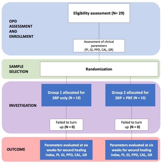 This study was a split-mouth randomized controlled clinical trial. Systemically, healthy patients with an age range from 30 to 60 years old with probing pocket depth (PPD) ranges from 5 to 6 mm and willing to participate in the research were selected from the Outpatient Department, Periodontology, VYWS Dental College and Hospital, Amravati. Patients were classified as Stage III Grade A periodontitis according to the 2017 periodontal disease classification [27]. The present study was structured as a split-mouth trial to thoroughly examine the varying responses of individual hosts to two different treatment approaches. This study was registered on Clinical Trial PRS, Protocol Registration and Results System, no. NCT05908929, on 16 June 2023, as a retrospective trial registration.