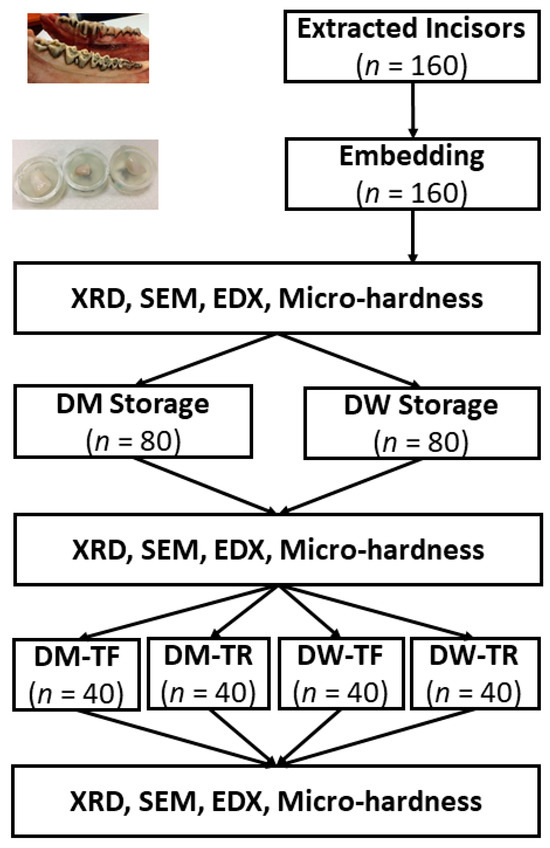 Figure 1 shows a flow chart of this study. Bovine incisors (N = 160) were extracted and the buccal side of the crown was cut into dimensions of ~5 mm × 5 mm with a low-speed saw. Bovine teeth were used because their enamel microstructures are close to those of humans, with a larger flat area [30]. These specimens were randomly allocated into four groups: half (80 teeth) were stored in demineralising solution (DM) and the other half were stored in deionised water (DW) for 96 h. Then, they were brushed for five min with a force of 2.0 ± 0.1 N with a manual toothbrush that had either fluoride-infused (TF) or regular (TR) bristles. Microhardness (Vickers), X-ray diffraction (XRD), energy-dispersive X-ray spectroscopy (EDS), and scanning electron microscopy (SEM) were used to investigate the surfaces of the bovine enamel specimens before and after brushing.