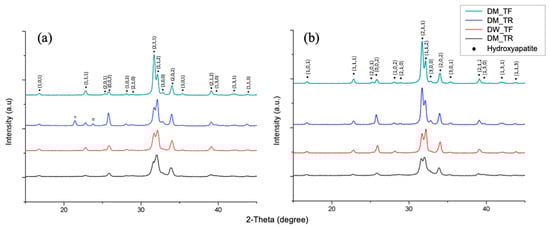 XRD spectrum of samples after treatment with DM and DW (a) before and (b) after toothbrushing with TF or TR. No changes were found except two impurity peaks (labelled as hollowed inverted triangle and star) in the DM_TR group before toothbrushing.