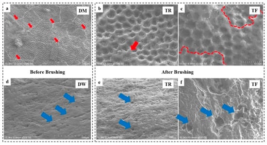 Representative enamel surface images (a) after storing in demineralising solution before brushing; after brushing with (b) toothbrush with regular bristles and (c) toothbrush with fluoride-infused bristles; (d) after storing in deionised water before brushing; and after brushing with (e) toothbrush with regular bristles and (f) toothbrush with fluoride-infused bristles. Red arrows: cracks; blue arrows: pits and holes.
