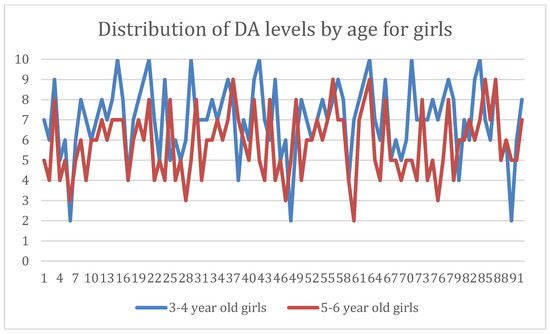 When dental anxiety levels were compared by gender, the findings indicated that, in contrast to the boy’s group, where anxiety levels rise in direct proportion to age, girls in the first study group, who were between the ages of 3 and 4 years, had higher levels of dental anxiety. In the second study group, consisting of girls between 5 and 6 years old, however, we observed lower DA levels (Figure 2 and Figure 3).