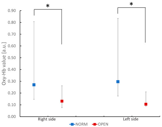 The OPEN group showed a smaller chewing-related increase in BBF than the NORM group (Figure 1). There was no statistically significant difference between the sides in each group. In addition, this reduction in OPEN was observed on both the right and left sides of the inferior frontal gyrus.