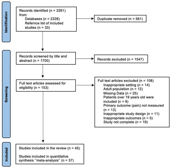 A total of 2261 studies were identified after the electronic and manual search, while 1700 remained after excluding duplicates. Following the title and abstract screening, 153 articles were selected for full-text review and examined against the eligibility criteria in detail, and 1547 studies were excluded. Twenty-five studies had missing data; although the authors were contacted, these data were not provided. Fourteen studies had an inappropriate setting. Moreover, twelve studies involved an adult population, and nine studies included patients over 19 years of age. Five studies had inappropriate outcomes, and thirteen studies did not measure pain. Additionally, eleven studies had an inappropriate study design. Finally, nineteen studies were excluded because they were not complete. Consequently, forty-five studies were identified and included in the review, and thirty-seven studies were eligible for the meta-analysis (Figure 1).