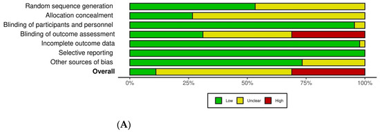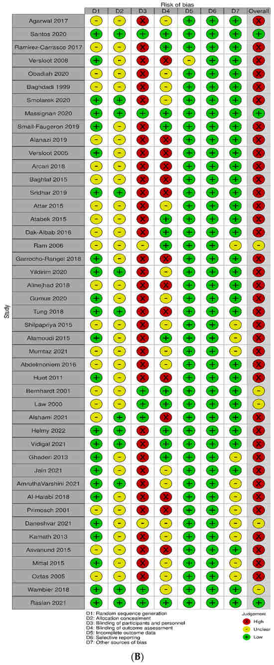 (A) Overall risk of bias. (B) Risk of bias for individual studies [20,21,22,23,24,25,26,27,28,29,30,31,32,33,34,35,36,37,38,39,40,41,42,43,44,45,46,47,48,49,50,51,52,53,54,55,56,57,58,59,60,61,62,63,64].
