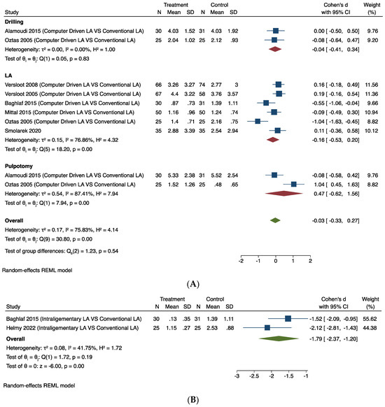 Seven studies provided comparable data for this outcome [23,24,27,28,29,40,47]. Figure 3A shows the results of the meta-analysis. Pooling the results of these studies using a random-effects model and the Cohen’s d standardised mean difference (SMD) showed that the use of computer-driven LA (infiltration/IANB) was no better than conventional LA in relieving intra-operative pain associated with dental procedures (SMD −0.03, 95% CI −0.33 to 0.27). The substantial heterogeneity (I2 = 75.83%) in this estimate is likely to be due to the different tools used to measure the outcomes and the ways of delivering LA via infiltration/IANB in each trial.