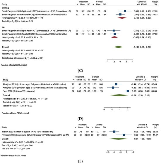 Random-effects meta-analysis evaluation of local anaesthesia for comparisons: (A) Computer-driven LA versus conventional LA. (B) Intra-ligamentary LA versus conventional LA. (C) Intraosseous LA versus conventional LA. (D) LA agent (articaine versus lidocaine). (E) Topical anaesthesia [23,24,27,28,29,40,47].