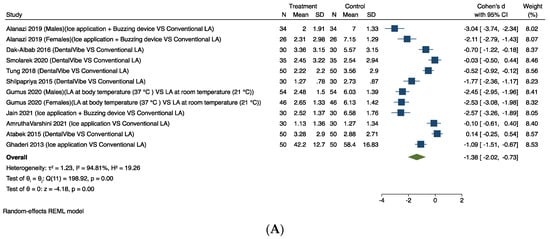 Ten studies provided comparable data for this outcome [35,40,49,50,53,54,58,59,61,63]. Figure 4A shows the results of the meta-analysis. Pooling the results of these studies using a random-effects model and the Cohen’s d standardised mean difference (SMD) showed a significant difference in favour of using mechanoreceptor and thermal receptor stimulation to relieve intra-operative pain associated with LA (SMD −1.38, 95% CI −2.02 to −0.73). The considerable heterogeneity (I2 = 94.81%) in this estimate is likely to be due to the studies having considered different tools to measure the outcomes and the different mechanoreceptor and thermal receptor stimulation used in each trial.
