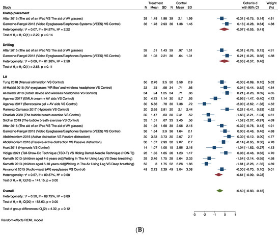 Thirteen studies provided comparable data for this outcome [25,26,30,31,32,33,35,36,38,43,51,52,56]. Figure 4B shows the results of the meta-analysis. Pooling the results of these studies using a random-effects model and the Cohen’s d standardised mean difference (SMD) showed that the use of different behavioural interventions significantly relieved intra-operative pain associated with dental procedures (clamp placement, LA, and drilling) (SMD −0.50, 95% CI −0.83 to −0.18). The considerable heterogeneity (I2 = 88.75%) in this estimate is likely to be due to the different tools used to measure the outcomes and the different behavioural interventions used in each trial.