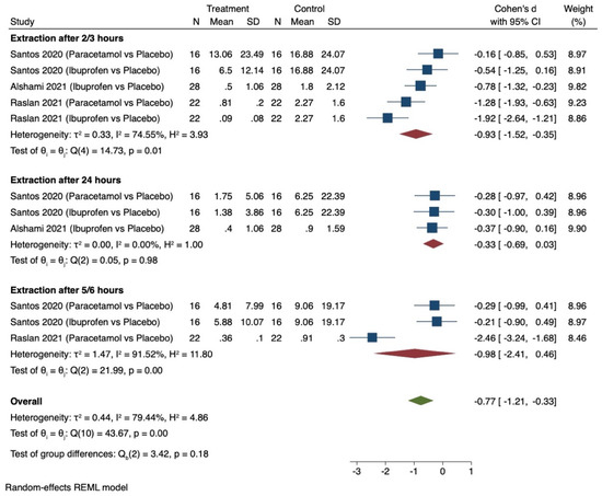 Only three studies provided comparable data for this outcome [39,41,42] and all related to pharmacological interventions. Figure 5 shows the results of the meta-analysis. Pooling the results of these studies using a random-effects model and the Cohen’s d standardised mean difference (SMD) showed that the use of pre-emptive analgesics significantly relieved post-operative pain associated with extraction between intervention and control groups (SMD −0.77, 95% CI −1.21 to −0.33). The considerable heterogeneity (I2 = 79.44%) in this estimate is likely to be due to the studies having considered different tools to measure the outcomes and the different pre-emptive analgesics used at different times in each trial.