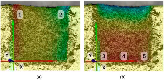 After the placement of the composite material with the bulk technique in a layer measuring 4 mm, the lateral surface of the material was sprinkled with a thin layer of carbon dust, using the tip of a brush. The specimen was positioned at a 30 cm distance from a digital camera (Nikon D3100, Nikon Corporation, Tokyo, Japan, and Tamron 90mm macro lens, Tamron Co., Hasunuma, Japan). A remote control was used to operate the camera, to prevent any vibrations caused by direct handling. Before light initiation and right after that, a high-resolution photograph (6000 × 4000 pixels, ISO 100 sensitivity, 1/50 shutter speed, f22) was obtained. We enhanced the luminosity of the final photograph and altered its contrast using the Microsoft Photos (Microsoft Corporation, Redmond, Washington, DC, USA) application to facilitate the identification of the analyzed pattern by the DIC software (GOM Correlate, GOM Metrology, Leuven, Belgium). The images were correlated in the software, and the displacement of the particles was calculated. Each sample was examined at 5 different points of the surface area. Both horizontal and vertical particle movements were analyzed along the X and Y axes. Horizontal movements were analyzed at two points of the top layer, while vertical movements were analyzed at three points of the bottom layer (Figure 2). All the data were introduced into Excel (Microsoft Corporation) spreadsheets.