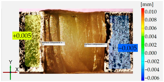 In this part of the study, a very important step was to visualize the bending of the cavity walls, which simulated cuspal deflection. For this reason, a black-and-white pattern had to be realized on the surface of the cavity walls, too. A brush was used to administer two layers of white acrylic paint onto the sample surface. To obtain the intended texture, the painted surface was sprinkled with a thin layer of carbon dust, using the tip of a brush. The same imaging protocol as that in the previous description was used, with the difference being that in this case, images were taken before light initiation and 10 min after that. The photographs were taken from the occlusal view. The images were correlated in the GOM Correlate software (GOM Metrology, Leuven, Belgium), and the cuspal displacement was calculated by taking the sum of the absolute displacement values of the cavity walls on each side of the restoration.