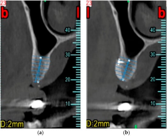 This allowed for the study of the difference in bone volume detectable following the regeneration intervention. All radiographic examinations were performed in the same center and with the same machine. The settings of the radiographic machine were not necessarily the same for each patient and each CBCT scan: the kilovoltage was kept fixed and stable for each image, while the exposure time and optical density (mAs) varied from time to time. Radiographic images were therefore considered comparable following calibration of the measurement tool used.