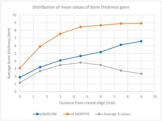 The greatest increase in bone thickness occurs at 4.5 mm from the most coronal point of the crest, reaching a peak difference of 3.80 ± 1.51 mm in average thickness. These findings are graphically depicted in Figure 2.