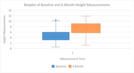 In the boxplot below (Figure 3), the distribution of height measurements collected at baseline and after 6 months are visually represented. For baseline measurements, the median is depicted at 4.24, with an interquartile range (IQR) of 2.70. At the 6-month mark, the median increases to 7.99, with an IQR of 3.28, reflecting a general increase in the measurements over time.