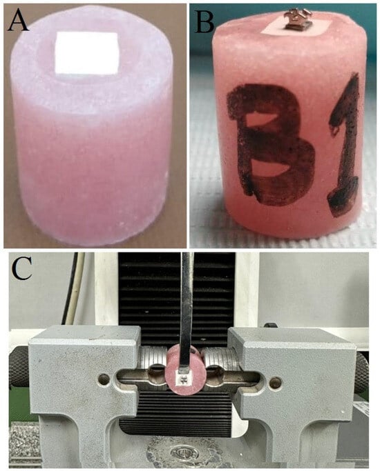 A random number was allotted to each specimen before testing to avoid bias during testing. SBS tests were performed by a universal testing machine (Model 2710-113, Instron, Norwood, MA, USA). A vertical shear load was applied to each bracket’s base parallel to the PEEK/adhesive/bracket interface at a crosshead speed of 1 ± 0.1 mm/min until fracture (Figure 1C) [25,26,27]. The debonding load was recorded in Newtons (N) and then divided by the bracket base area (10.5 mm2) to obtain the SBS in megapascals (MPa) [28].