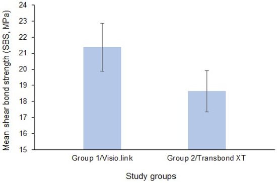 The literature recommends that the minimum SBS be in the range of 6–8 MPa, and the maximum SBS must be lower than the fracture threshold of enamel, which is around 14 MPa [23,30]. However, it must be remembered that SBS obtained in vitro are typically 40% higher than those obtained in vivo owing to the complexity of the oral environment, where moisture contamination can noticeably reduce the SBS [31]. The current study demonstrated that the SBS of brackets bonded using Visio.link primer and traditional orthodontic primers were 21.38 ± 1.486 MPa and 18.63 ± 1.291 MPa, respectively. The difference in SBS between the primer groups was statistically significant; however, the difference seemed clinically irrelevant, as both these values exceeded the recommended optimal SBS values. In orthodontic practice, obtaining optimal SBS rather than the maximum possible SBS is preferable [32]. Brackets bonded to fixed prosthodontic surfaces should be compatible to resist the oral biomechanics, masticatory forces, and functional activities of the patient, but also adequate enough to facilitate debonding upon treatment completion without any deleterious effect on the bonded surface of the restoration [33].