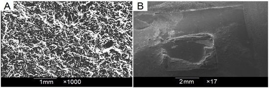 A SEM micrograph of the surface-treated and debonded PEEK specimen is presented in Figure 2. The surface-treated PEEK surface (Figure 3A) showed an irregularly speckled pattern with deep grooves and craters. The PEEK specimen, after debonding (Figure 3B), showed a significant amount of adhesive remaining on most bracket base surface areas (representing an ARI score > 2).