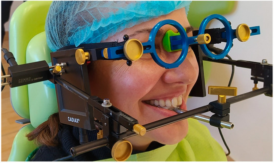Cadiax 4 assembled on a study participant. The upper and lower facebows, the side arms, the double-stylus system, and the flags are all clearly depicted.