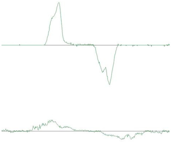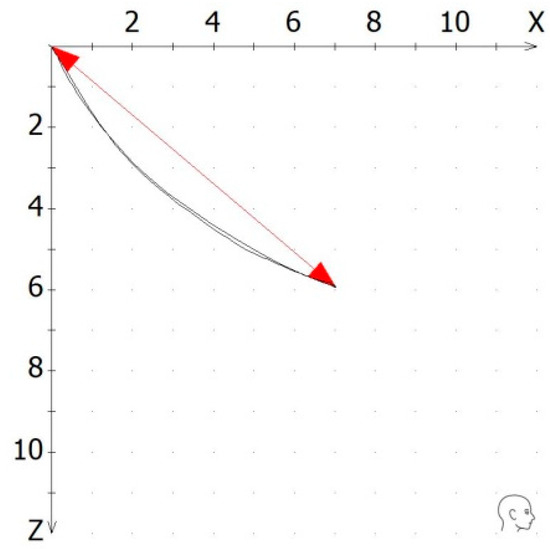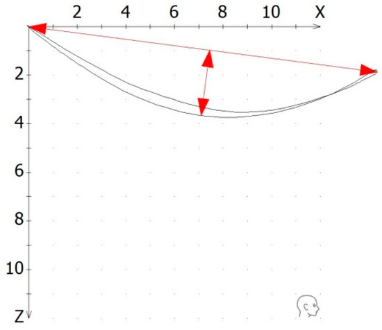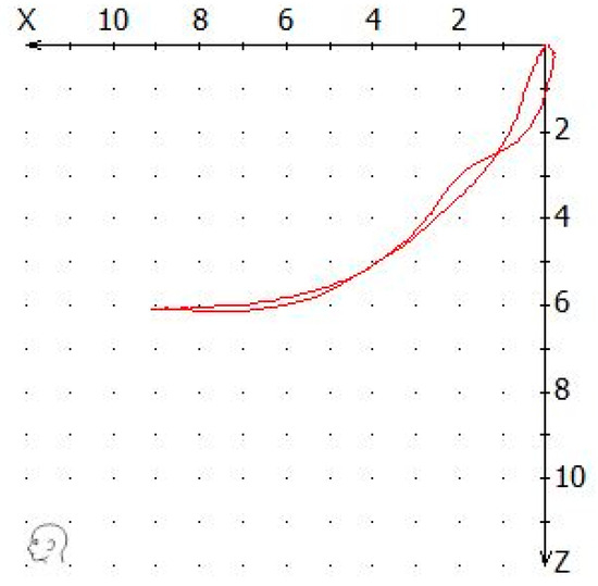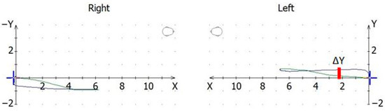 - Quantity: The quantity of each movement was recorded. This value was calculated as the spatial distance between the starting position and the most excursive point of the tracing. It was represented as the “S” secant from the starting position to the end point of the excursion (Figure 2).