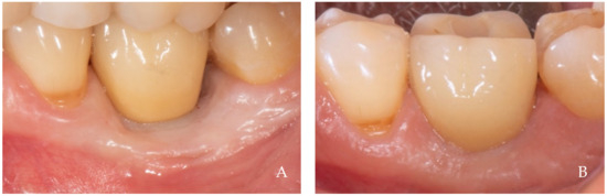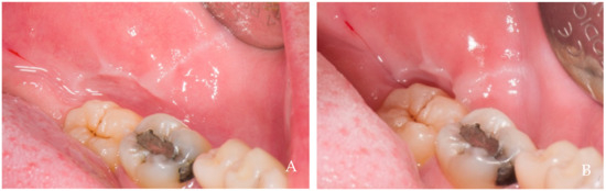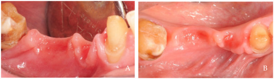 (A,B) A 62-year-old female patient, non-smoker, who does not use drugs that induce gingival hyperplasia and does not exhibit bruxism. Another case of keratinized tissue growth under an old bridge that had de-cemented. Note the increase in marginal soft tissue only in the keratinized area, while in the area of the alveolar mucosa, the phenomenon did not occur due to the reasons reported in the text.