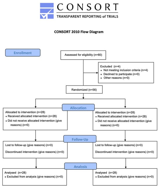 The study included 56 patients who were recruited from the Department of Oral Surgery at the Faculty of Dental Medicine, Medical University—Plovdiv and Center of Dental Implantology, Research Institute Medical University—Plovdiv. The study was approved by the ethics committee of the Medical University—Plovdiv. The study was registered in the NCT06496906 Registry of Clinical Trials of ClinicalTrials.gov and followed the guidelines described in the CONSORT 2010 (Consolidated Standards of Reporting Trials) statement on clinical trials—Figure 1.