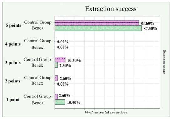 Figure 4 presents the success of the extractions in the control group and the study group graded on a scale from 1 (unsuccessful) to 5 (full success). The number of completely successful extractions (5 points) is almost equal in both groups. There were slightly more failures (1 point) in the study group, but there were equally as many partial failures (2–4 points) in the control group. The average success of the extractions with the Benex extractor was 4.61 points, while the average for the classical instruments was 4.55 points. There was no statistical significance between the two groups in terms of the number of successful and failed extractions.