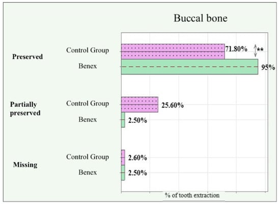 Buccal cortical plate preservation—preserved (no loss); partially preserved (loss < 4 mm); missing (loss > 4 mm). **: significant difference.