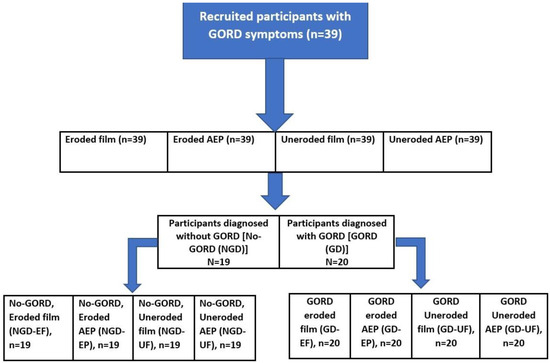 This study was approved by the National Research Ethics Service (NRES) in North East York Research Ethics Committee (REC Ref 18/NE/0099). A power calculation based on published data from patients presenting with ETW as a result of dietary acids [20] and others on protein levels [29,30] using a paired t-test and an effect size of 0.6 and 80% statistical power gave a total of 24 participants required to identify a 5% difference at the 5% significance level. A total of 39 participants were recruited accounting for potential dropouts and also due to the availability and willingness of participants. Additionally, this number was chosen to give statistical power to detect a standardised mean difference between participants with GORD symptoms (GDS), patients who were diagnosed with GORD (GD), and those not diagnosed with GORD (NGD).