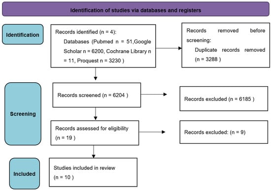 The flowchart summarizing the selection process is depicted in Figure 1. The search yielded the following: 51 titles on PubMed, 6200 on Google Scholar, 11 on Cochrane library, and 3230 on Proquest registers. Electronic searches have identified 9492 studies. Of these, 6204 articles remained after the duplicates removal and were examined on the basis of title and abstract. After this first screening, 6185 articles were excluded based on the title and abstract text, and the remaining 19 were examined for eligibility based on the full text. At the end of this further selection 10 studies were identified.