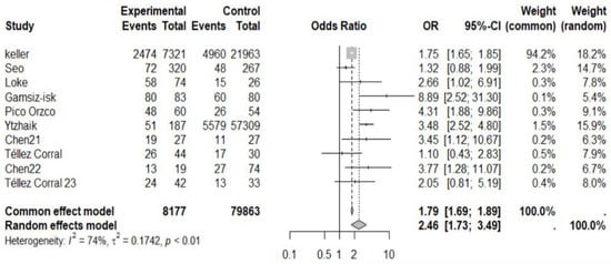 Forest plot of the association between OSAS and periodontitis [18,19,25,26,27,28,29,30,31,32].