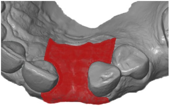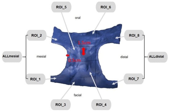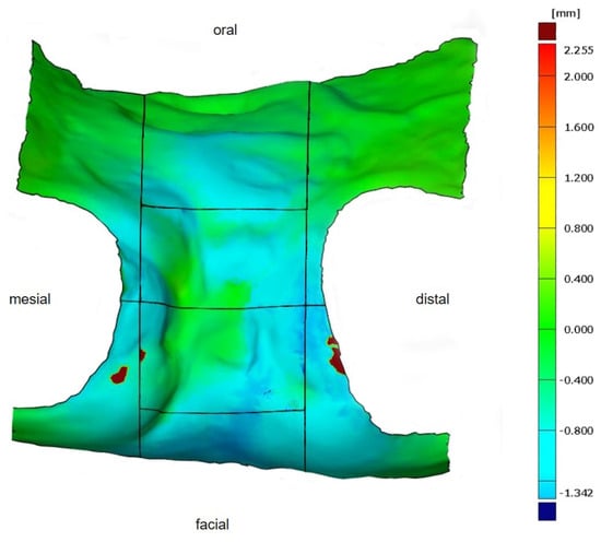 First, the postoperative scan (t0), which served as a reference for all of the further scans of the follow-up controls, was imported into the program and edited (Figure 3). To make the analysis comparable between different subjects, the three-dimensional scans of the maxilla were limited to a specific region of interest (ROI) (Figure 4). For this purpose, a cuboid with defined side lengths was used depending on the extracted tooth (Table 1 and Figure 5). To interpret separate areas of the entire ROI, it was segmented into 10 different subareas (Figure 6). The subdivision was performed on the basis of the anatomical conditions and defined as follows. At a distance of 0.5 cm from the adjacent tooth, the area from facial to oral was defined as the ALLmesial and ALLdistal. The further subdivision was based on the center of the socket and that of the adjacent teeth, whereby the entire ROI and the described areas (ALLmesial and ALLdistal) were again divided centrally (Figure 6). Finally, the two resulting central areas were subdivided at the edge of the socket in facial and oral terms at a distance of 1.5 cm. This ROI was used to match all of the subsequent scans to define the changes in volume in terms of an area comparison (Figure 6). The volumetric changes in these 10 areas during the five follow-ups (t1, t2, t3, t4, and t5) were compared to those of the first postoperative scan (t0). The STL files to be superimposed comprised of entirely closed geometries. In order to calculate a change in volume, the models were superimposed. The matching was refined using the “local best fit” function of the program. The tooth surfaces of the immediate neighboring teeth were selected mesial and distal as congruent areas in the ACTUAL model (scan at t0). This step made it possible to avoid inaccuracies in the superimposition, particularly in the area of the ROI. As a result, the digital maxillary model of the first control appointment was aligned congruently and automatically with the TARGET (scans at t1-t5) model. The analysis methodology was used to calculate the discrepancy between the TARGET and ACTUAL models (area comparison). This involved calculating the valid surface area in square millimeters (mm2, Table 1) and the average deviation of all measurement points between the target and actual models in millimeters (mm) within the regions of interest (ROIs). The distances between corresponding mesh vertices (closest point) on the superimposed surfaces were then displayed in a color-coded distance map (Figure 7). By multiplying the corresponding surface area by the deviation of each point measured within the ROI, the total volume in cubic millimeters (mm3) was calculated by the software as the sum of all such calculations. It represents the average volume increase or decrease in three dimensions in the space between the two surfaces being compared.