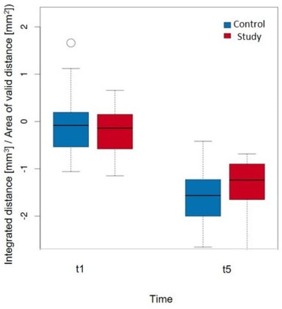 The detailed values of the study group are shown in Table 5. At timepoint t1, the greatest decrease in volume was observed in ROI3, whereas the ROIs (4, 5, ALLmesial) showed an increase in volume. ROI3 also showed the greatest decrease in volume at time t5, with all of the other ROIs (4, 5, ALLmesial, ALLdistal) also showing a decrease. The linear model (Table 6) clearly showed that the volume decrease over the entire observation period was significantly greatest in ROI3. However, this was not statistically significant in terms of group affiliation; herein, it is only possible to derive a tendency for the study group (it experiences a smaller volume decrease). This trend (without statistical significance) can also be observed in the isolated comparison of ROI3 between t1 and t5 (Figure 8). The decrease in volume was greater in the control group at t5 than in the study group.