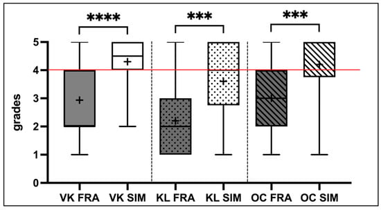 Box plot diagram of the grades from the preparation exam evaluated by the three examiners (VK = Preclinical Prosthetics, KL = Clinical Prosthetics, and OC = Oral Surgery) for participants in groups FRA and SIM. The “+” symbol indicates the arithmetic mean of the grades. The horizontal red line marks the passing threshold. Statistically significant differences between the respective groups are visually represented by asterisks “*”, with significance levels indicated as p < 0.001 (“***”), and p < 0.0001 (“****”).