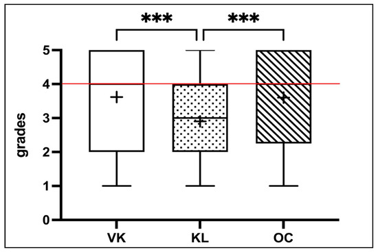 Box plot diagram illustrating the grade distributions for the preparation exam as evaluated by the three examiners. The “+” symbol denotes the arithmetic mean of the grades for each examiner. The horizontal red line represents the passing threshold. Statistically significant differences between groups are indicated by asterisks “*”. The number of asterisks corresponds to the p-value significance level: p < 0.001 (“***”).