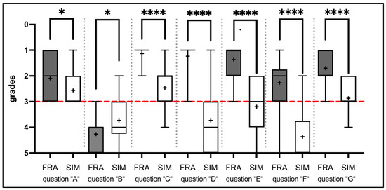 The horizontal red dashed line visualizes a “neutral” (grade 3) statement according to the Likert-type scale. The “+” symbol denotes the arithmetic mean of the grades for each examiner. Mean ± SEM were calculated and the Mann–Whitney U test (* = p < 0.05) was performed. “*” indicates significant statistical differences between the groups. The number of asterisks corresponds to the p-value significance level: p < 0.050 (“*”) and p < 0.0001 (“****”).