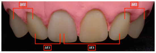 Dental arch model with designations of the teeth used for the color distance calculations (ΔE1 = color distance of reference tooth and lateral incisor, ΔE2 = color distance of canine and lateral incisor).