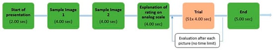 The images of the dental arches were presented on a MacBook Pro (Retina, 13”, 2012, Apple, Cupertino, CA, USA), which was color calibrated using i1 Display Pro and i1 Profiler (X-Rite, Grand Rapids, MI, USA). A standardized procedure was programmed using PsychoPy3 (Jonathan Peirce and Open Science Tools Ltd., Nottingham, UK), a toolbox for flow control of image presentations and ratings based on the language Python. First, two examples were shown, which were not included in the assessment, to familiarize the subjects with the procedure. Assessment was started with an explanation of how to rate a shown picture by clicking on the visual analogue scale. The ratings on the visual analogue scale were converted internally into a numerical range from 0 to 100 for evaluation. Subsequently, each picture was shown for four seconds. After each picture, the participants were either asked to rate whether the right and left central incisors had the same color or to rate whether the combination of shades was harmonious. The first question was asked for detecting evaluation of color and the second for detecting evaluation of harmony. The participants were asked to rate the statement on a visual analogue scale from “strongly agree” to “strongly disagree” by clicking on the scale (the original study questions and visual analogue scale being in German). Rating was not time limited. After the first assessment rating, the same picture was shown again and the second statement was inserted. Without consideration of rating time, the trial lasted approximately seven minutes. The sequence of images was different for each participant and was randomly selected by the program. The results were stored in a pseudonymized form. In Figure 3, the flow chart of presentation is shown.