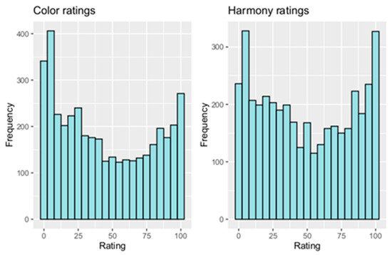 Cumulative frequency distributions of color and harmony are shown in Figure 4. The evaluation resulted in 4080 ratings. A large spread of ratings was detected. Many participants opted for extreme values in their evaluation of color and harmony. Most ratings were made in the value ranges of 0–25 and 85–100.