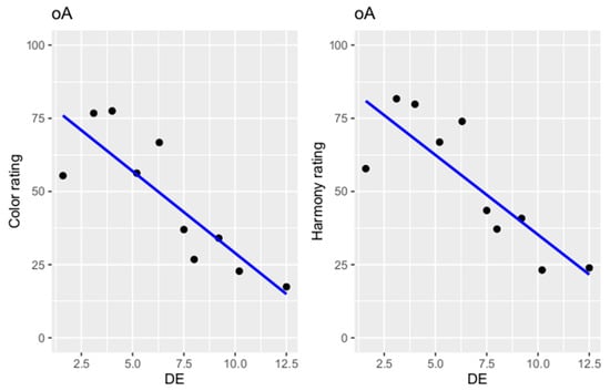 Scatter plot of color and harmony ratings (regression line in blue; oA = participant ratings, in which teeth 13, 12, 22 and 23 had shade 4A and there was no color variance in the dental arch; DE = ΔE value).