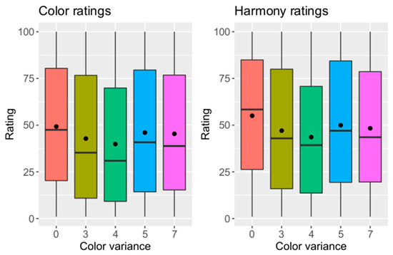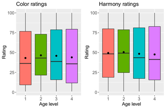 Depending on the age of the participants, the color and harmony ratings are shown in Figure 7. Only small differences of the distributions between the age groups can be observed. Shapiro–Wilk tests showed that normal distributions cannot be assumed (p < 0.05). Kruskal–Wallis tests detected significant differences between the age groups in color rating (p = 0.01) and no significant differences in harmony rating (p = 0.27). A Nemenyi post hoc test showed significant differences in color rating between age groups 1 and 2 (p = 0.014). There was no linear dependency between age and color ratings in a regression analysis (p = 0.69), but there was a linear dependency between age and harmony rating (p = 0.043). However, explanatory potential was low (coefficient of determination R2 = 0.11).