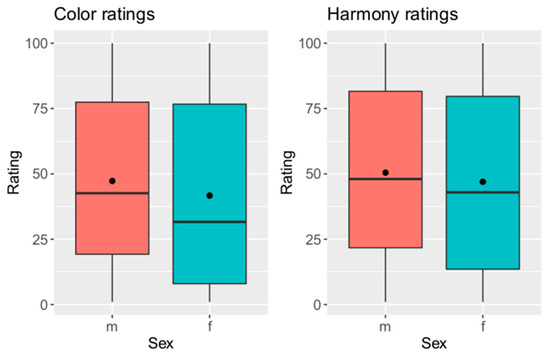 Color and harmony rating depending on sex of participants (y-axis = rating on visual analogue scale, x-axis = sex; m = male, f = female).