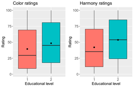 Color and harmony ratings depending on education level of participants (y-axis = rating on visual analogue scale, x-axis = educational level; 1 = main school degree or intermediate educational qualification, 2 = general high school diploma or technical college entrance qualification).