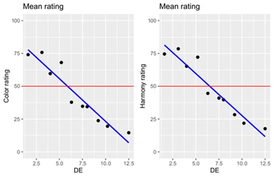 There was a negative relationship between the ΔE value and the ratings of the participants. Increasing ΔE values were rated less color-matched and increasingly inharmonious (Figure 5). Increasing ΔE value by one unit resulted in a decrease of the color score by 6.50 points and of the harmony by 6.40 points (Table 6). A significant difference between the ratings of color and harmony and the ΔE value was detected in a regression analysis (p < 0.0001).