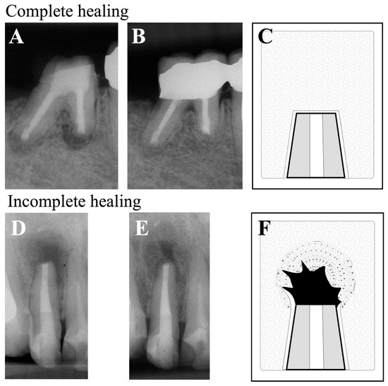 Representative radiographs as examples of clinical success. Complete healing (Top Row): an example of a mandibular first molar that was radiographically assessed as ‘complete healing’ 1 year after EMS. (A) Immediate postoperative, (B) 1-year follow-up, and (C) diagram of apical healing used for classification developed by Rud and Molven [18,19]. Incomplete healing (Bottom Row): a maxillary lateral incisor was radiographically assessed as an example of ‘incomplete healing’ 1 year after EMS. (D) Immediate postoperative, (E) 1-year follow-up, and (F) diagram of apical healing used for classification, as described [18,19].