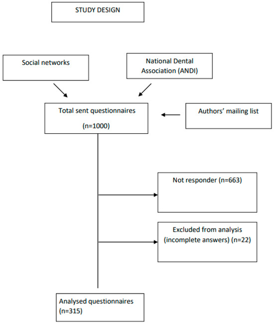 Three hundred and fifteen dentists actively participated in the survey, reflecting a response rate of 31.50%, considering the initial pool of 1000 invited professionals (Figure 1). The characteristics of respondents are displayed in Table 1.