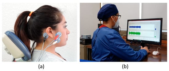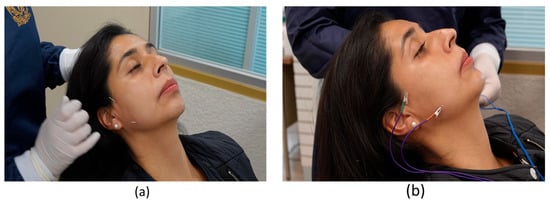 The clinical electromyographic recording method was standardized with intraoperative and interoperative recording tests, and was performed using intraclass correlation coefficients, p-value (>0–85). The electromyographic recordings were taken with the Electromyograph 1.2 UNAM-CINVESTAV® recording system (hardware and software). Neuromuscular electrical activity was determined by root mean square (RMS) analysis. For the recording, three electrodes were placed (at the muscle’s insertion, the muscle’s origin, and the retroauricular area) (Figure 1). The recording was made at maximum intercuspation for 30 s; the action potential expressed by the electrical energy was recorded in microvolts per second (μV/s).