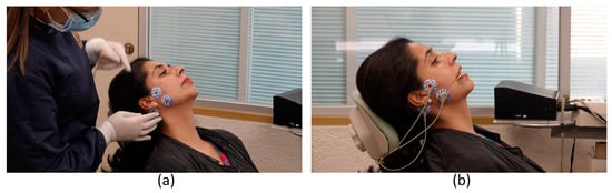 Transcutaneous electrostimulation therapy. (a) Placing electrodes on the masseter muscle; (b) application of electrical stimulation with electroacupuncture equipment.